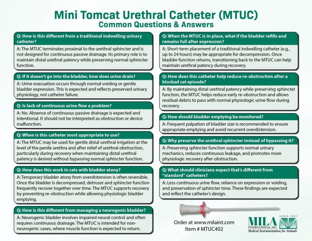 A specialized device designed for managing feline urethral obstructions, the MILA Mini Tomcat Urethral Catheter provides an advanced single-catheter technique to "unblock and drain." It is primarily used to relieve urethral obstructions and facilitate continuous bladder drainage in clinical settings.