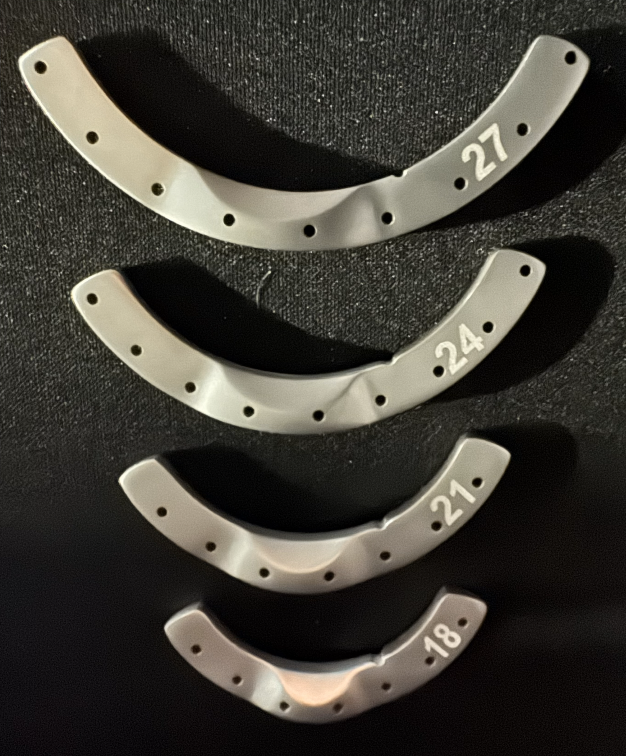 Version 2: Introduces refined features including a wider radial body, improved clearance for bicortical stay pins, a pointed V-edge for precision, and a sloped bump to keep pin holes perpendicular.